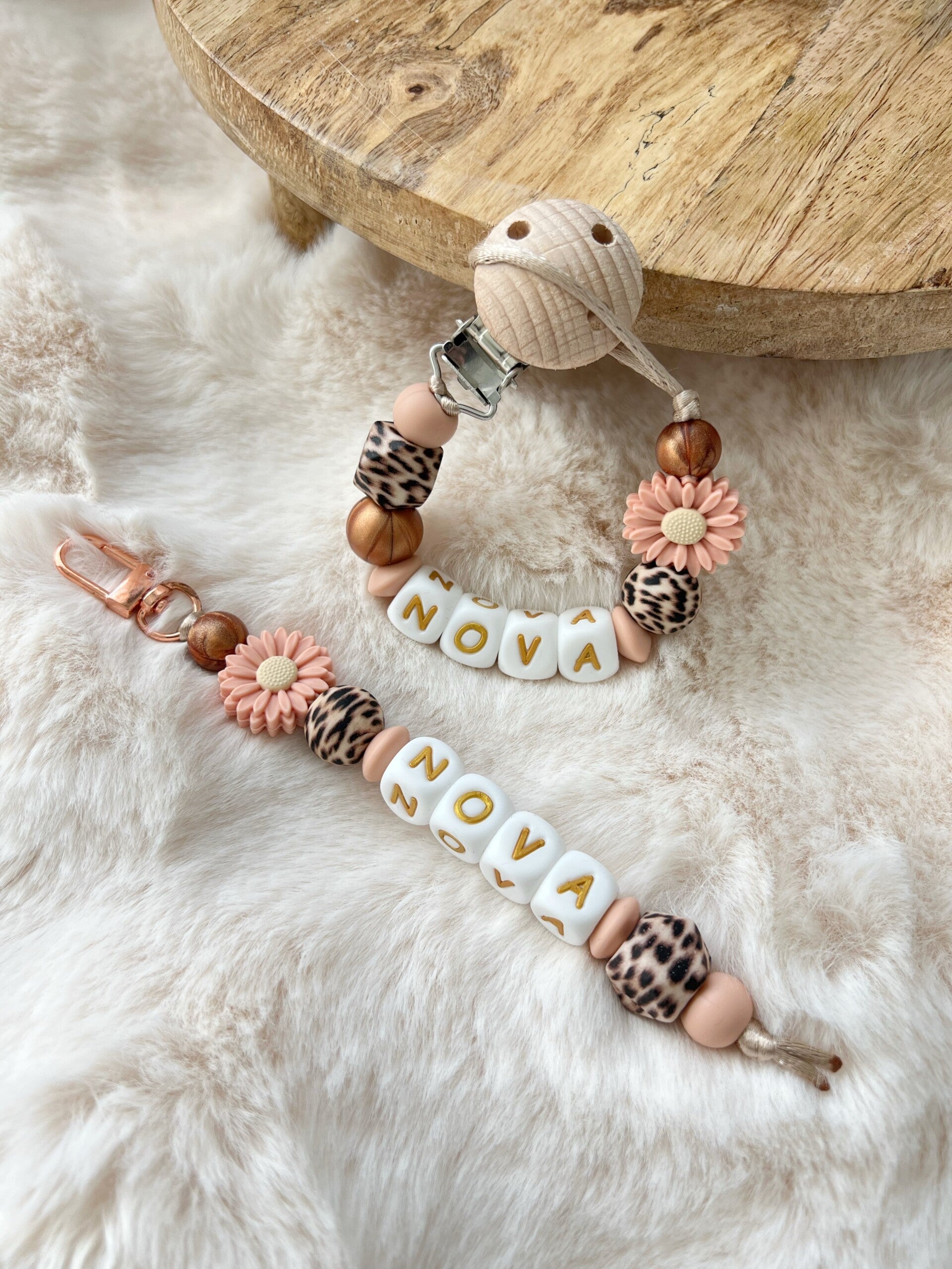 Onze bruine peachachtige cadeauset is een geliefd kraamcadeau. Het combineert een speenkoord met een bijpassende sleutelhanger of tassenhanger voor mama.